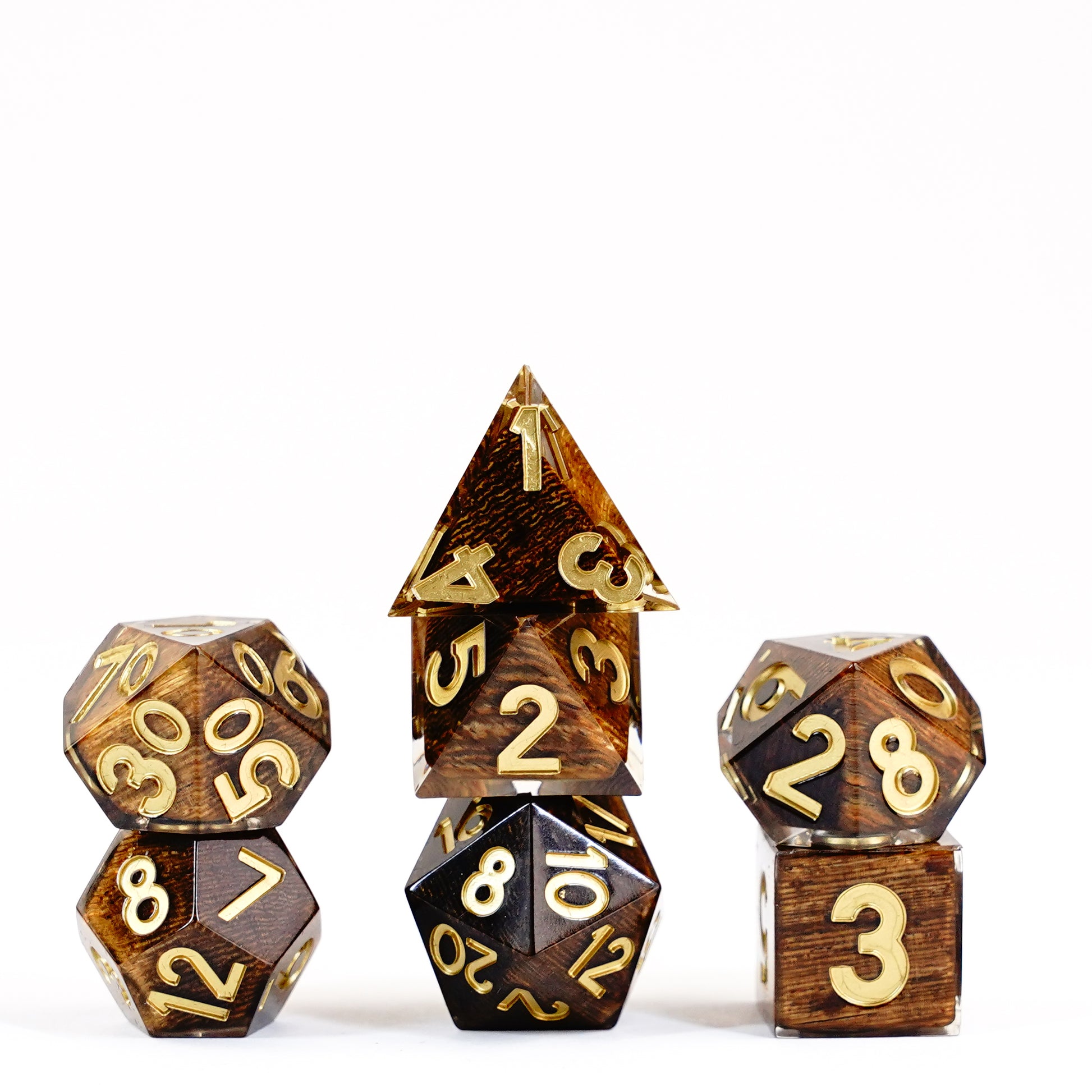 Beautiful wood is sealed in resin to create precise sharp edges. Because sharp edge dice are not tumbled, they are more precise than mass produced resin dice. Each 16mm polyhedral set comes with 7 dice (d4, d6, d8, d10, d10 (00-90), d12, and d20).