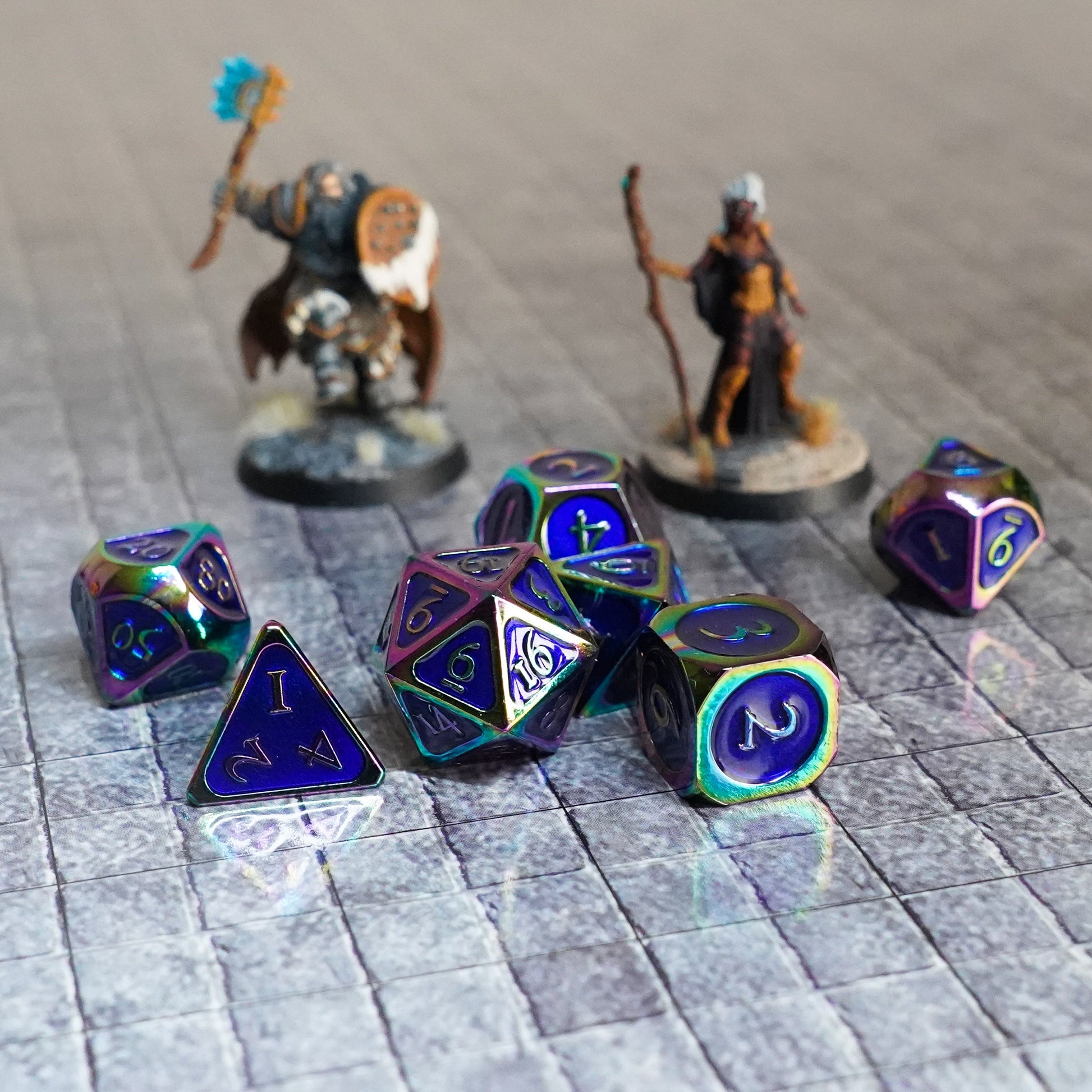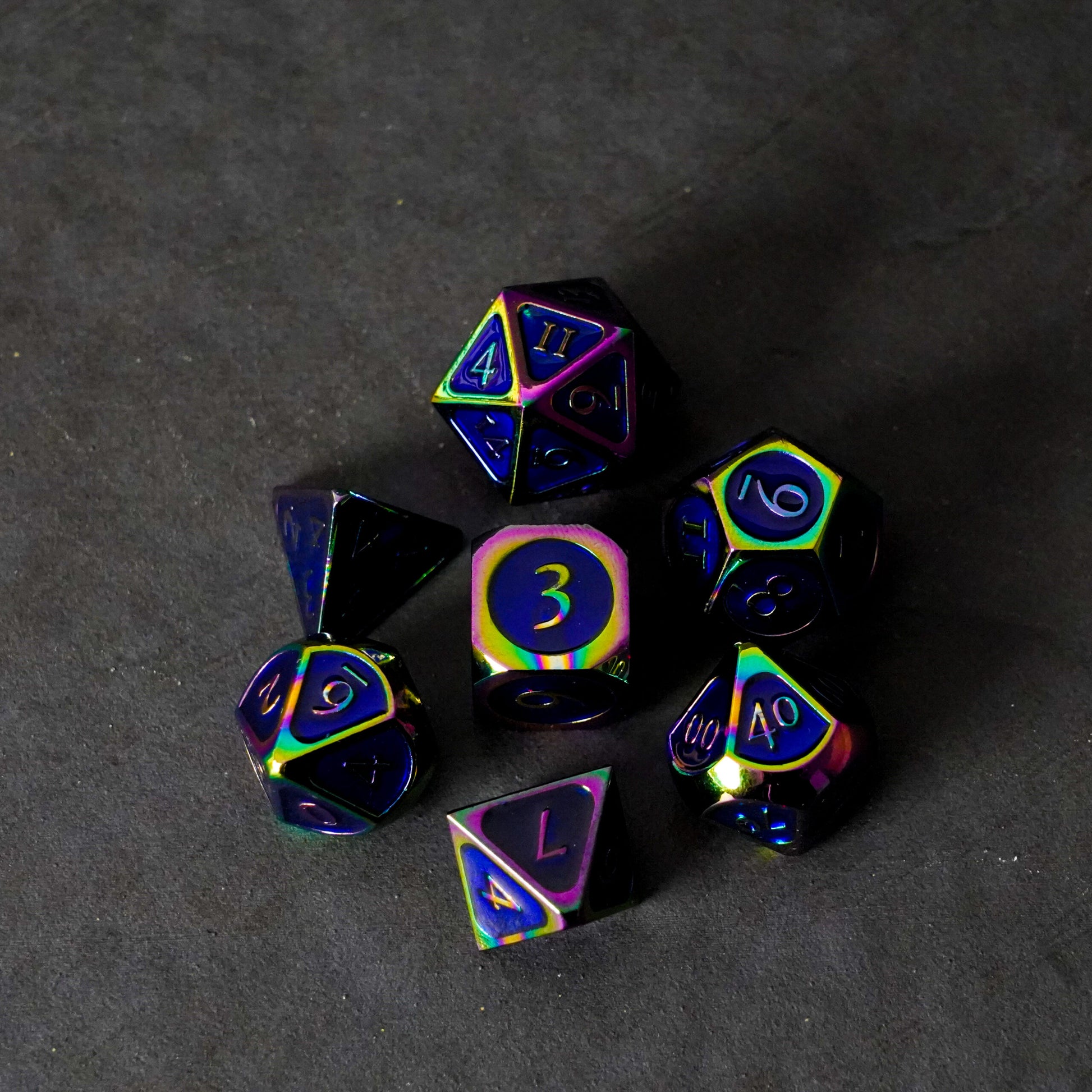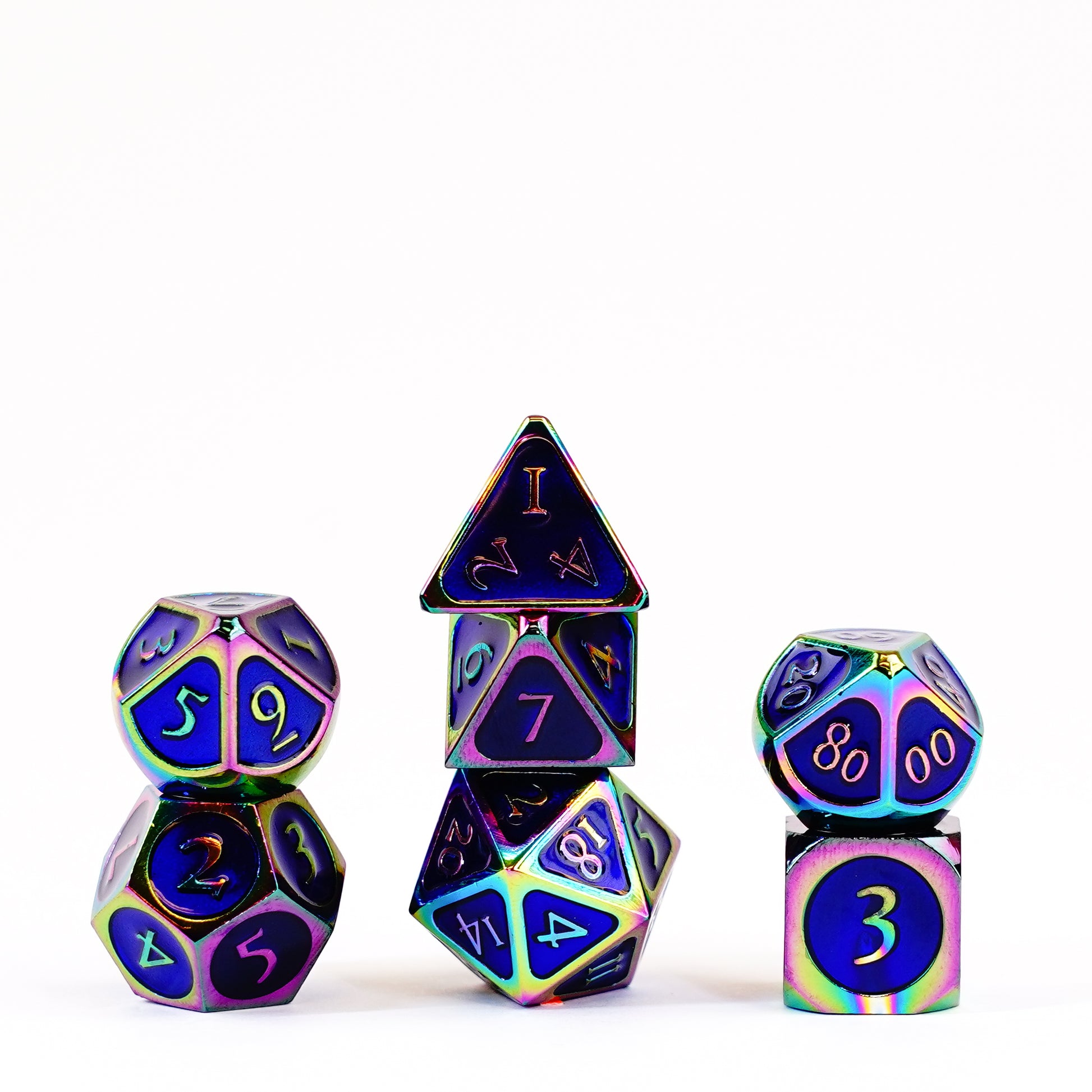 Upgrade your gaming experience! Made with solid zinc and plated with shiny-polished nickel, these 16mm metal dice sets are heavy in your hand, and are built to last. This is a full-sized 16mm polyhedral dice set that comes with 7 dice (d4, d6, d8, d10, d10 (00-90), d12, and d20). You can also purchase any of the individual sizes separately.