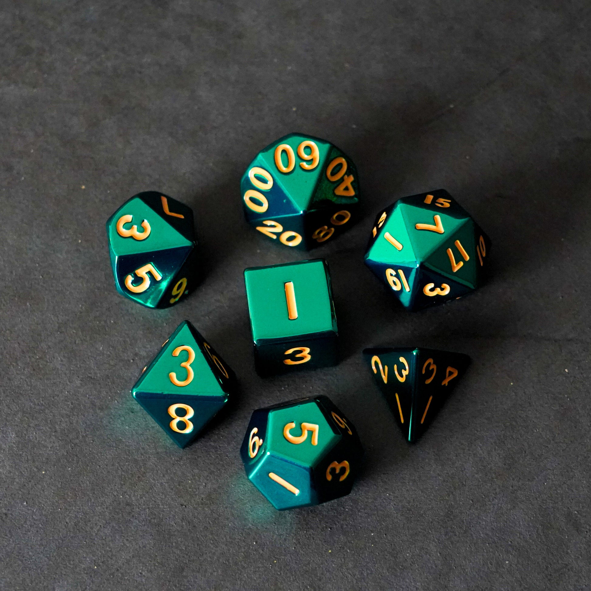 Upgrade your gaming experience! Made with solid zinc and plated with shiny-polished nickel, these 16mm metal dice sets are heavy in your hand, and are built to last. This is a full-sized 16mm polyhedral dice set that comes with 7 dice (d4, d6, d8, d10, d10 (00-90), d12, and d20). You can also purchase any of the individual sizes separately.